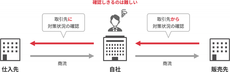 一方で、企業のセキュリティ対策は、外部からその状況を正確に把握することが難しいという課題があります。具体的なビジネスの場面を想定してみましょう。取引において、仕入先のセキュリティ対策状況を確認することもあれば、逆に販売先から確認されることもあります。ガイドラインを活用する場合はあるものの、各社独自のチェックリストで確認を行っているのが実態です。