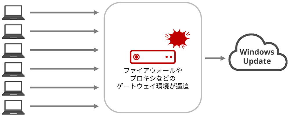 更に、社内ネットワークについても影響が出る可能性があります。これまでWSUSサーバから更新プログラムを取得していた各端末が、今後はインターネット上から更新プログラムを取得することになります。インターネットゲートウェイをデータセンターや本社など1ヵ所に集約している場合、トラフィックが集中し、輻輳を引き起こす恐れがあります。
