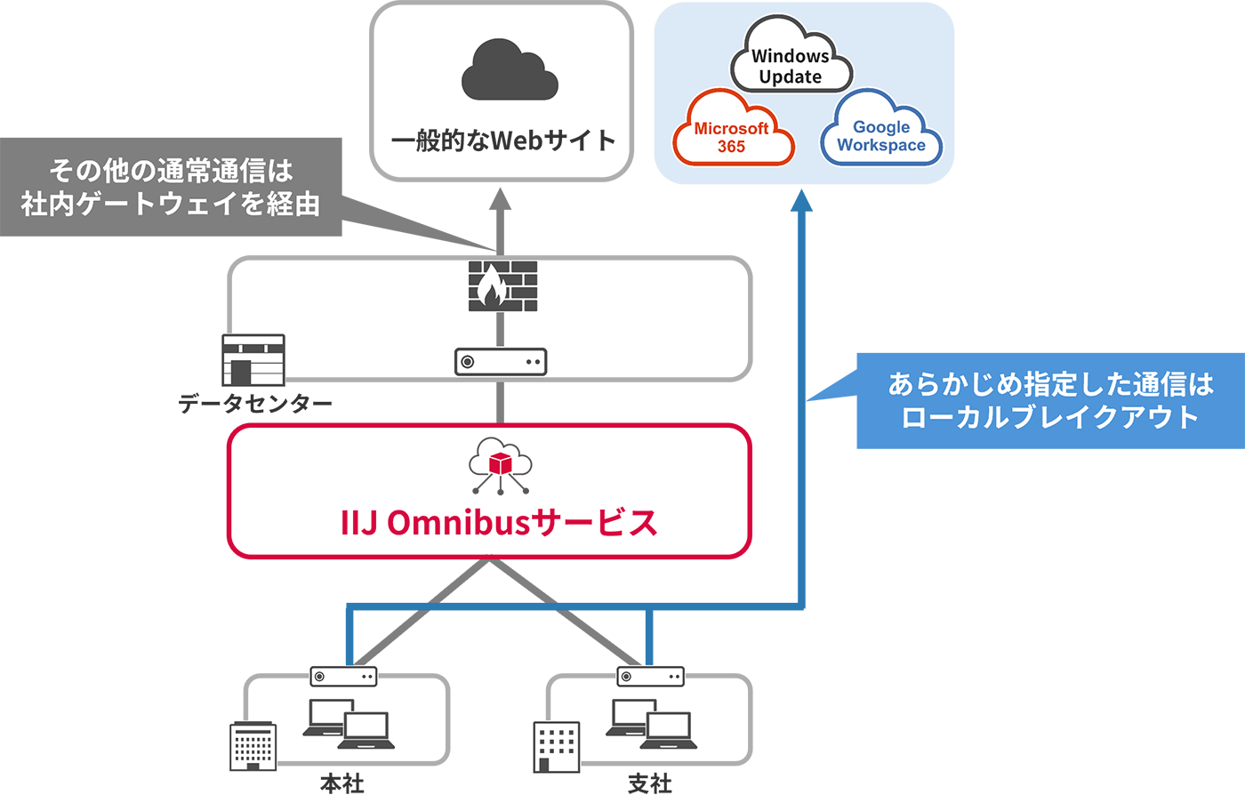 IIJが提供する「IIJ Omnibus(オムニバス)サービス」では、Windows Update通信のローカルブレイクアウトが可能です。ローカルブレイクアウトの設定にあたり、面倒な宛先情報の収集や不定期な情報更新の追従はフルアウトソースできるため、お客様は管理ポータル上で簡単にローカルブレイクアウトの設定ができます。