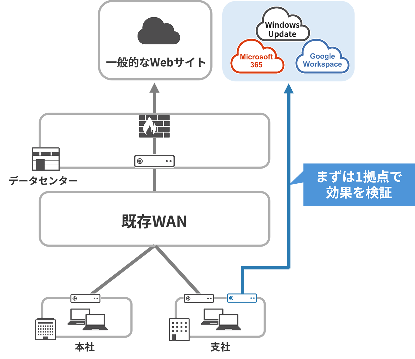 なお、WAN更改の導入ハードルが高い場合でも、既存のWANを踏襲しつつ、「トラフィック流量の多い拠点のみ」や「まずは検証として1拠点から」など、段階的な導入が可能です。