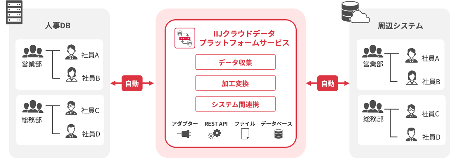 本コラムでご紹介したIIJクラウドデータプラットフォームサービスと組み合わせることで、社内に点在する様々な人事マスタデータをIIJ IDガバナンス管理サービスに集約することができます。その上で、人事イベントに合わせて、周辺システムへのアカウント登録/削除を自動化することが可能です。
