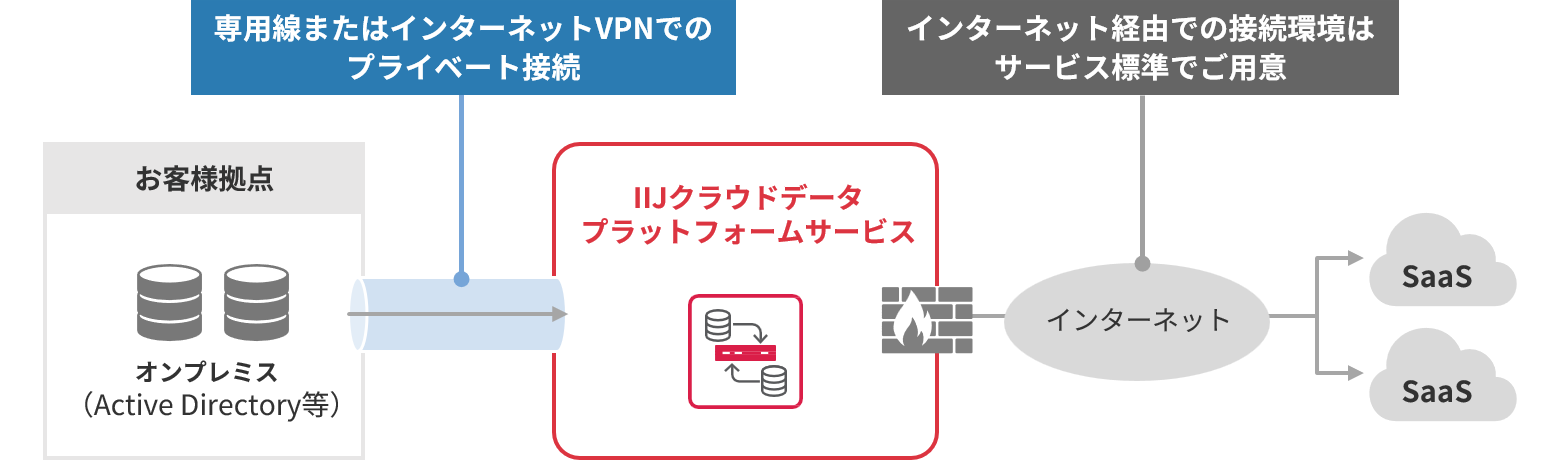 特にActive Directory(AD)など、社内ネットワーク内に存在する人事マスタや認証基盤との連携では、IIJが提供するインターネットVPNや専用線などのネットワークサービスと組み合わせることで、セキュアかつ安定した接続を実現します。