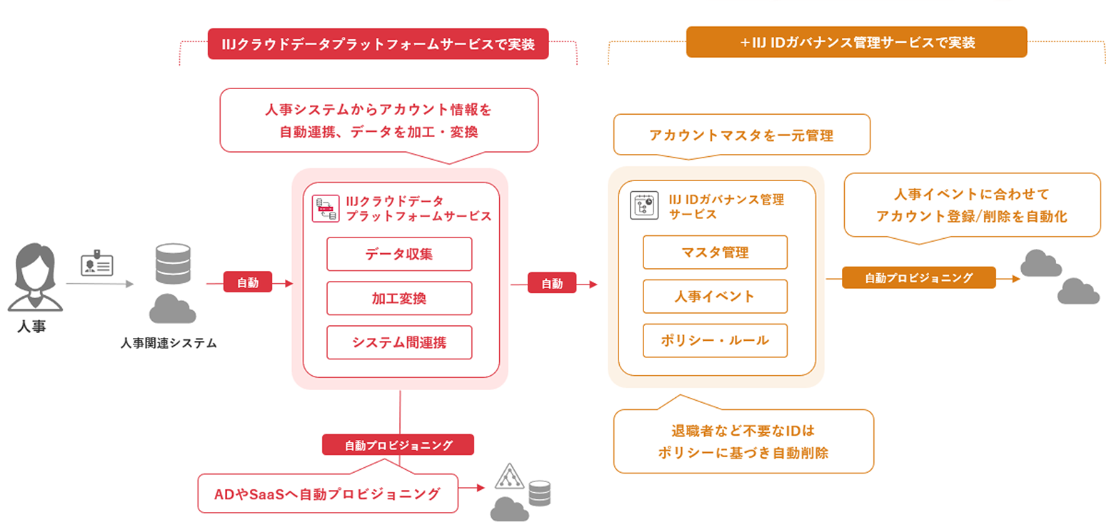 本コラムでご紹介したIIJクラウドデータプラットフォームサービスと組み合わせることで、社内に点在する様々な人事マスタデータをIIJ IDガバナンス管理サービスに集約することができます。その上で、人事イベントに合わせて、周辺システムへのアカウント登録/削除を自動化することが可能です。