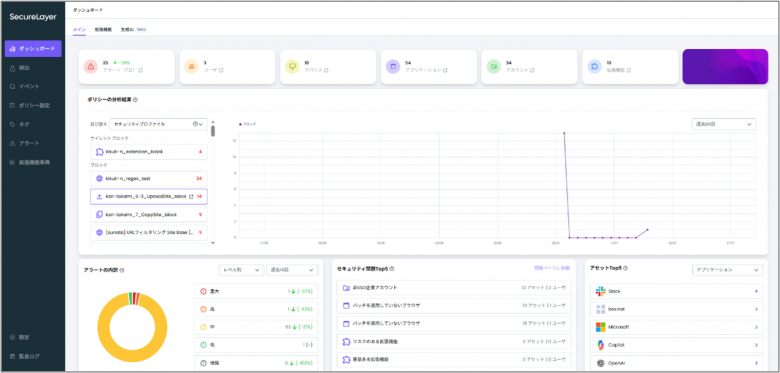 本機能の管理画面では、ポリシー設定、検出状態、イベントやアラートなどをWeb上で確認することが可能です。セキュリティ上の主要な問題(Top5)やアラートの内訳などもダッシュボード上で確認できます。